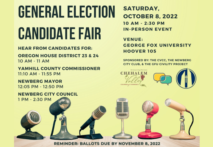Candidates for Oregon House District 23 & 24, Yamhill County Commissioner, Newberg Mayor and City Council, will participate in a 2022 Candidate Fair on Saturday October 8, from 10 am – 2:30 pm at George Fox University, room Hoover 105.